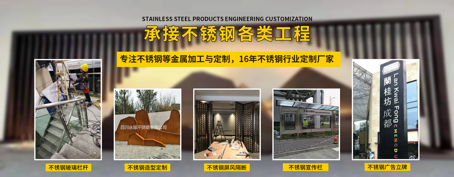 四川永耀不銹鋼有限公司是一家集開發(fā)、設計、加工、制作、安裝、并承接各種不銹鋼工程為一體的綜合性企業(yè)。多年來一直在專注于不銹鋼等金屬的加工與研發(fā)。在客戶群體中贏得了良好的聲譽,以專業(yè)專注的精神,致辭力于打造良好的產(chǎn)品和企業(yè)形象,對每一產(chǎn)品傾注全力,力爭每個細節(jié)精細,確保產(chǎn)品具有優(yōu)越的性能,優(yōu)美的外觀及優(yōu)良的品質(zhì),使公司產(chǎn)品深受廣大用戶的親睞。 本公司主要業(yè)務: 一、工程類 承攬:酒店、銀行、商鋪、寫字樓、公寓、城鐵、地鐵、公交、機關、 學校、廣場藝術雕塑、自動門、旋轉門、廣告欄、公